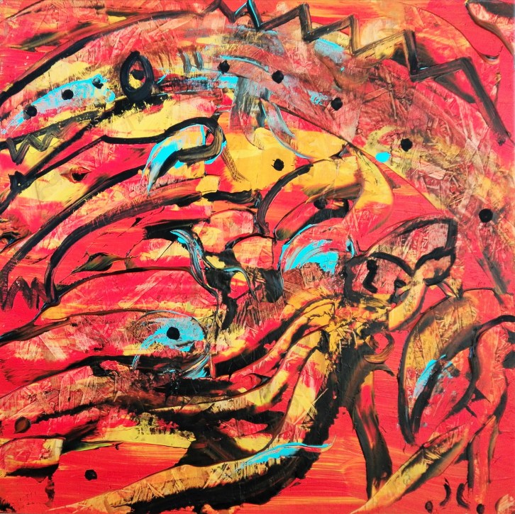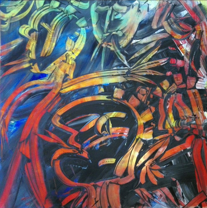 “DragonCaos and Knights”, acrylic on plexiglass, cm 100 x 100, 2017